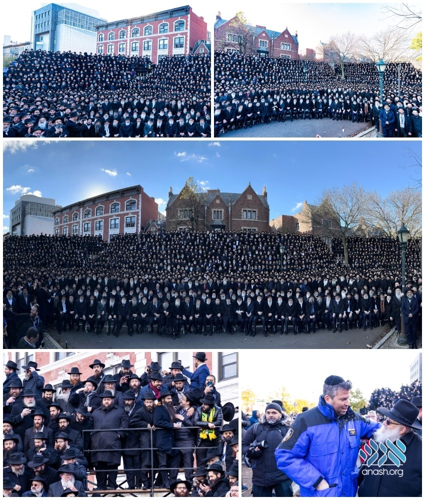 Thousands of Shluchim pose for a “class picture” outside Chabad World Headquarters at 770 Eastern Parkway, Brooklyn, N.Y., on Sunday, Nov. 20, 2022.