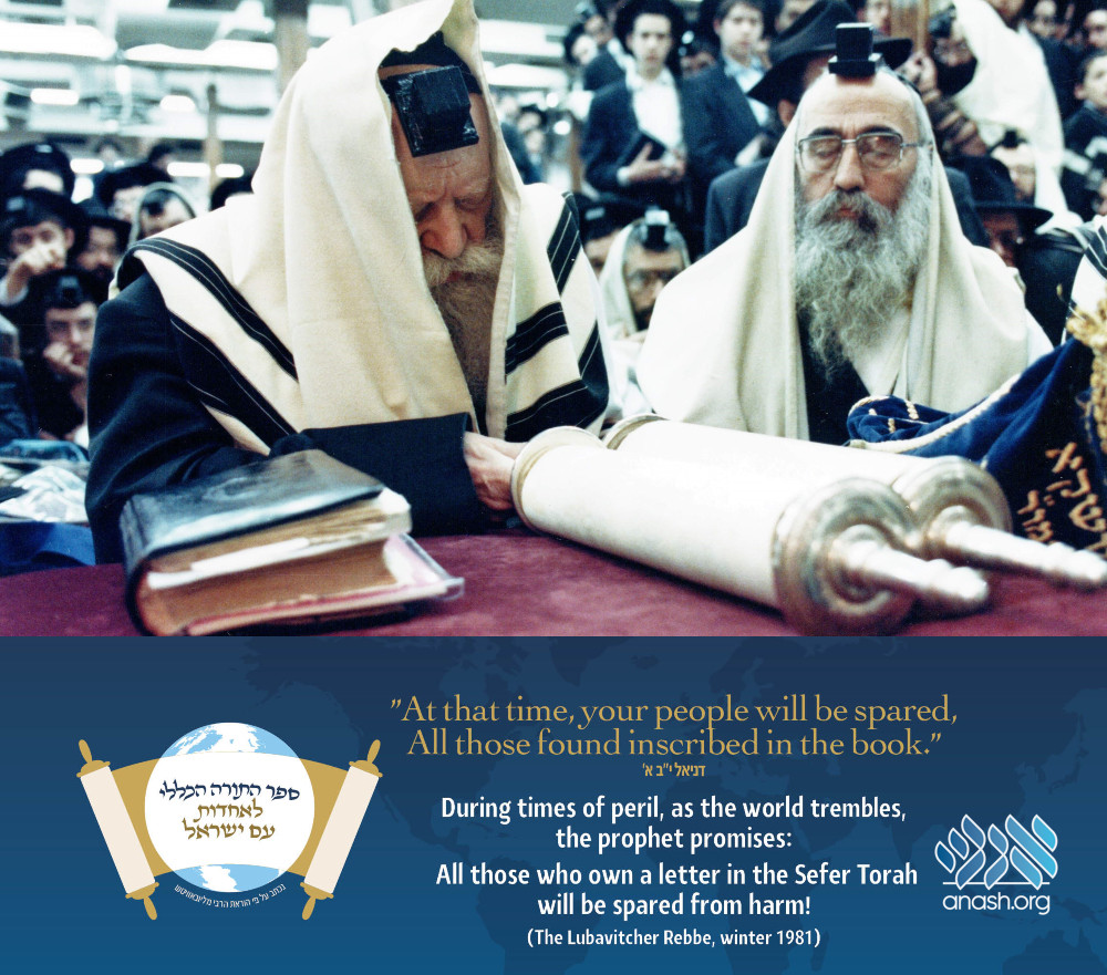In 5742 [1982] the Rebbe asked that Sefer Torahs should be written for Klal Yisroel and said that having a letter in the Sefer Torah will be rescued from any harm.