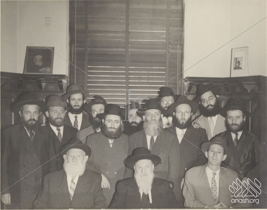 R. Moshe Zalman Feiglin, seated on the left, with the hanahalah of Yeshivas Tomchei Temimim Hamerkazis during his 1956 (5716) visit to New York. Rashag is seated in the center, and to his right sits R. Dovid Feiglin, R. Moshe’s son. Standing in the back row on the right is Harav Yitzchak Dovid Groner, later the Rebbe’s shliach to Melbourne. Library of Agudas Chassidei Chabad.