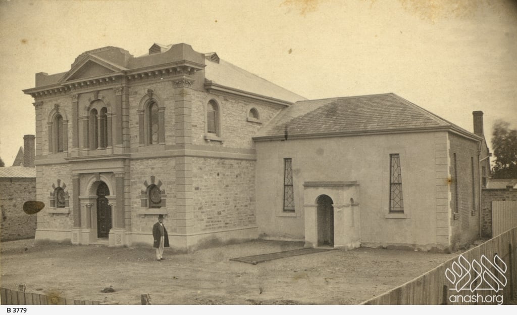 This image, captured in c. 1871, shows the old Adelaide shul constructed on Rundle Street in 1850 on the right, and its larger 1870 replacement on the left. The man standing in front may be R. Abraham Tobias Boas (1842-1923), rabbi of the congregation from 1869.