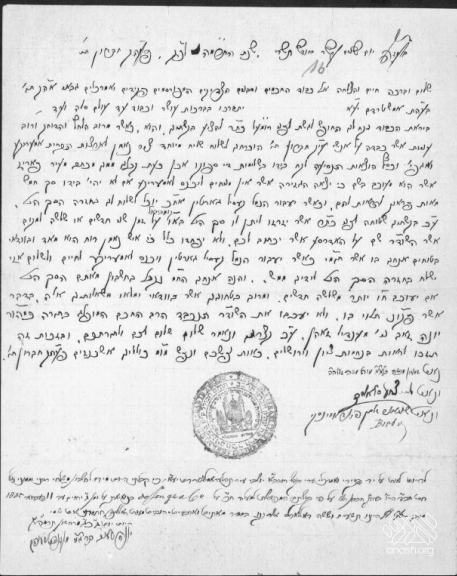 The letter, dated 12 Tishrei 5645 (1884), explains that they had dispatched “the wise sage, distinguished in Torah knowledge,” R. Yonah Zev Mendelson, to raise funds for the Jews of Chevron in America. They had sent him with sufficient money to pay his fare, but now in Paris, he had informed them that he needed to show that he had 500 francs in order to be allowed to board the boat. The Chevron rabbonim ask the Amsterdam committee to kindly lend R. Yonah Zev the required sum, assuring them that he will send it back after he has secured passage. A few lines in R. Yonah Zev’s handwriting at the bottom of the document confirm that he was indeed granted the loan.