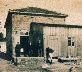 A faded black-and-white photograph, taken decades ago – nearly a century – shows the veteran Tzemach Tzedek shul in Petach Tikva during its early years. The image shows a modest, single-story rectangular building, with thick stone walls and a sloped tiled roof. At the front, there is a small wooden annex with a tiny window, attached to the main building like an added room.