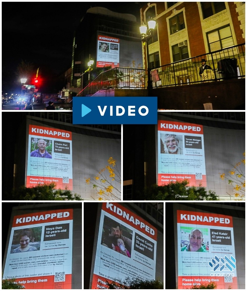 The faces of the 224 hostages being held captive by Hamas were projected onto the facade of the Jewish Children’s Museum in Crown Heights in order to raise awareness for their plight.