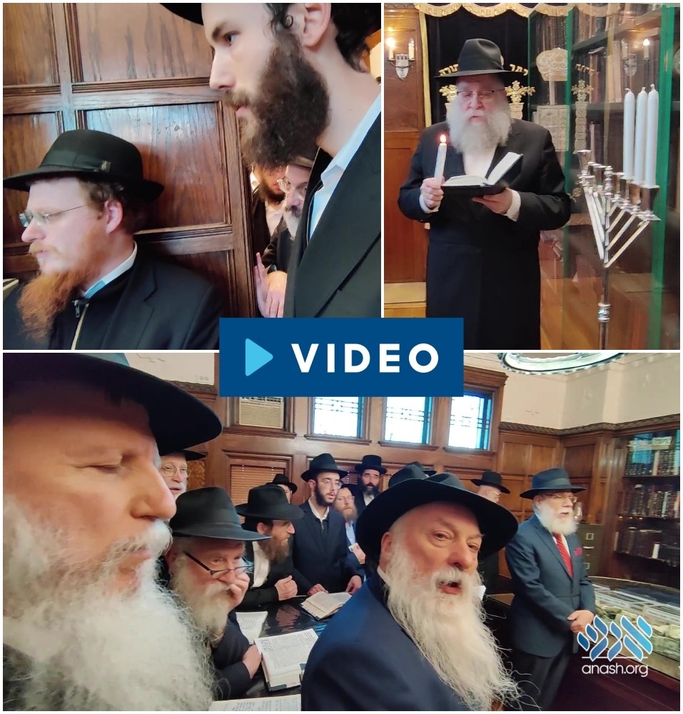 Watch: A small crowd gathered for mincha on Tuesday in the Rebbe’s room in 770, followed by the lighting of the third Chanukah candle by Rabbi Gavriel Schapiro and the singing of Haneiros Halalu.