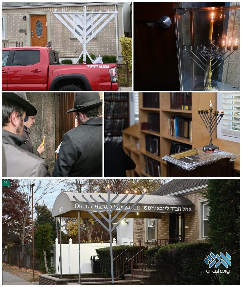 In the nearby tents, additional menorahs are placed at strategic points, to increase in the pirsumei nissa. Besides for a large menorah outside the Ohel, menorah are placed in a prominent position in the front tent, and in the tent that serves as a shul. Menorahs are also made available for visitors who may not yet have one of their own.