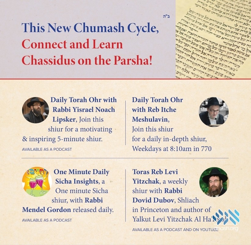 For the new Chumash Cycle, Connect and learn with the Parsha the Chassidishe Way! Irgun Torah presents these insightful shiurim for you to connect daily with the Chassidishe Parsha!