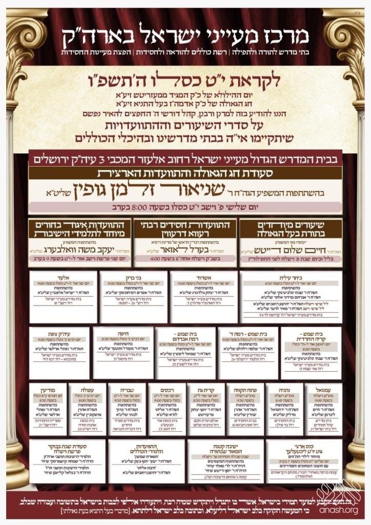 Thousands of Chassidishe yungeleit and bochurim from the Mayonei Yisroel Chassidus network participated in dozens of farbrengens across more than 20 cities in Eretz Yisroel in honor of Yud Tes Kislev, celebrated as the “Rosh Hashanah of Chassidus.”