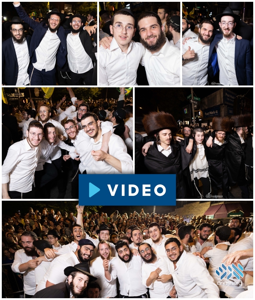 Thousands of people joined the dancing on Kingston Avenue on the first night of Chol Hamoed Sukkos with music by Eli Marcus and Yossi Cohen.