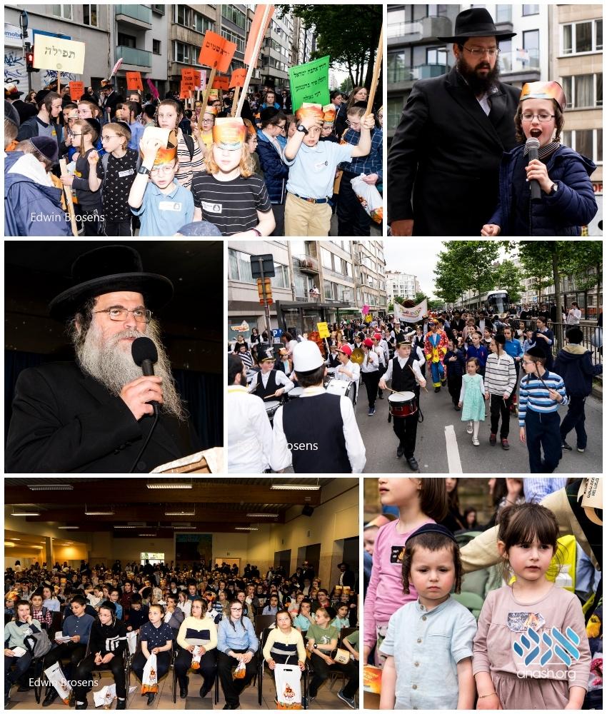 A downpour in Antwerp came to a halt as thousands of children and families marched through the streets for a Lag Baomer parade. Local schools, including Satmar, Belz, and Yavneh schools, ended school early to join the parade.