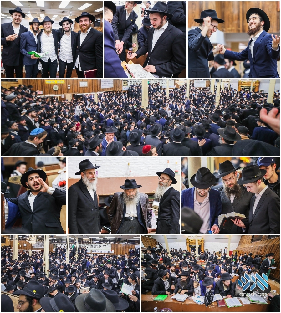 A large crowd packed the main zal of 770 in the final hours of Acharon Shel Pesach for Seudas Moshiach and a farbrengen, during which participants drank four cups of wine and sang niggunim of each of the Rebbeim.