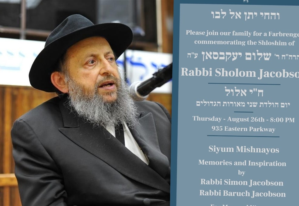 Students and friends will gather Thursday night to mark the shloshim of Rabbi Sholom Jacobson, who served as a mashpia in Crown Heights and dedicated his life to disseminating the Rebbe‘s Torah.