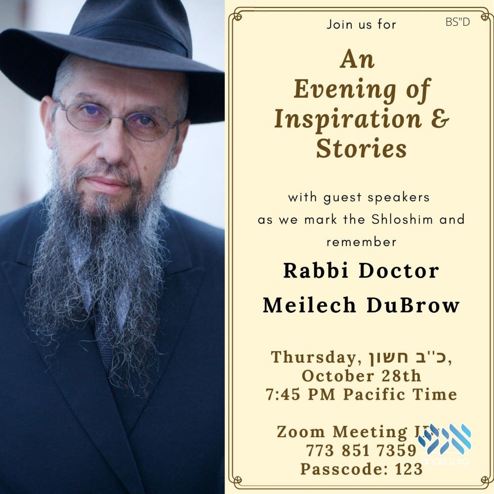 An online evening of inspiration and stories will mark the shloshim of Rabbi Doctor Meilech Dubrow, with guest speakers sharing memories and inspiration from his life.