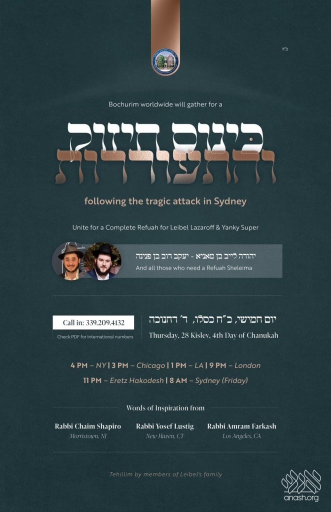 Chasidim and Yidden around the world are reeling from the tragic and heinous attack on the Chanukah celebration in Sydney. The Vaad Talmidei Hatmimim will be hosting a gathering of Chizuk and Hisorerus, bringing together bochurim from North America, Europe, Eretz Hakodesh, and Australia.