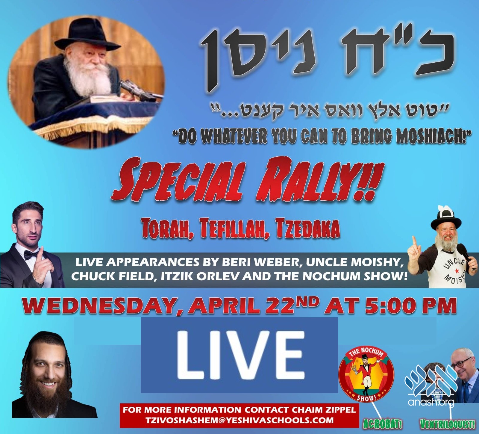 Join Yeshiva Schools of Pittsburgh for a special Chof Ches Nissan Rally featuring Uncle Moishy, Beri Weber, Chuck Field the ventriloquist, Itzik Orlev, and the Nochum Show!