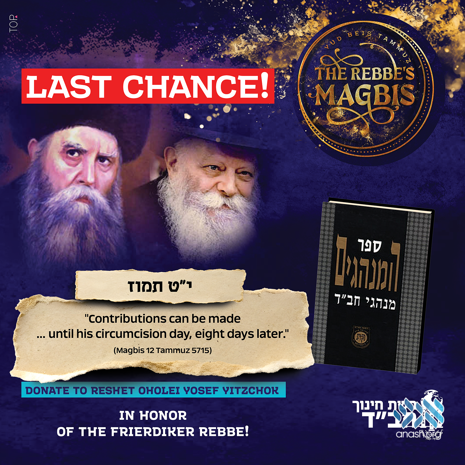 Today, Yud Tes Tammuz, marks the final day — Day Eight — of the Rebbe’s personal fundraising appeal in honor of the birthday and Chag HaGeulah of the Frierdiker Rebbe. This is your last opportunity. Don’t miss it!