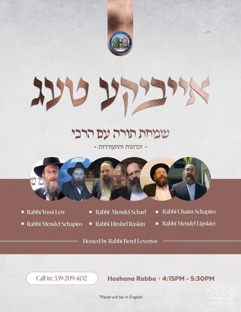 Today, Hoshana Rabba, at 4:15 PM, a live panel farbrengen will feature Zichronos and reflections from Chassidim who merited to celebrate Simchas Torah with the Rebbe.