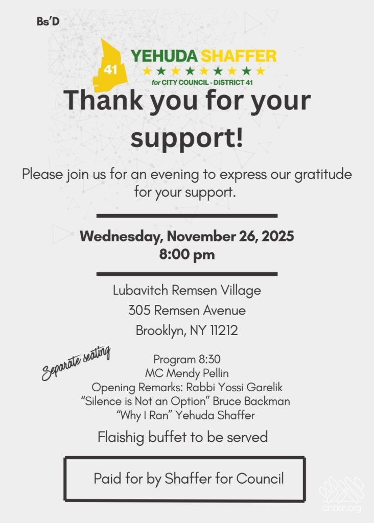 The Anash community of Crown Heights, Remsen Village, and East Flatbush is invited to a special appreciation event to thank all those who supported Yehuda Shaffer’s campaign for City Council District 41.