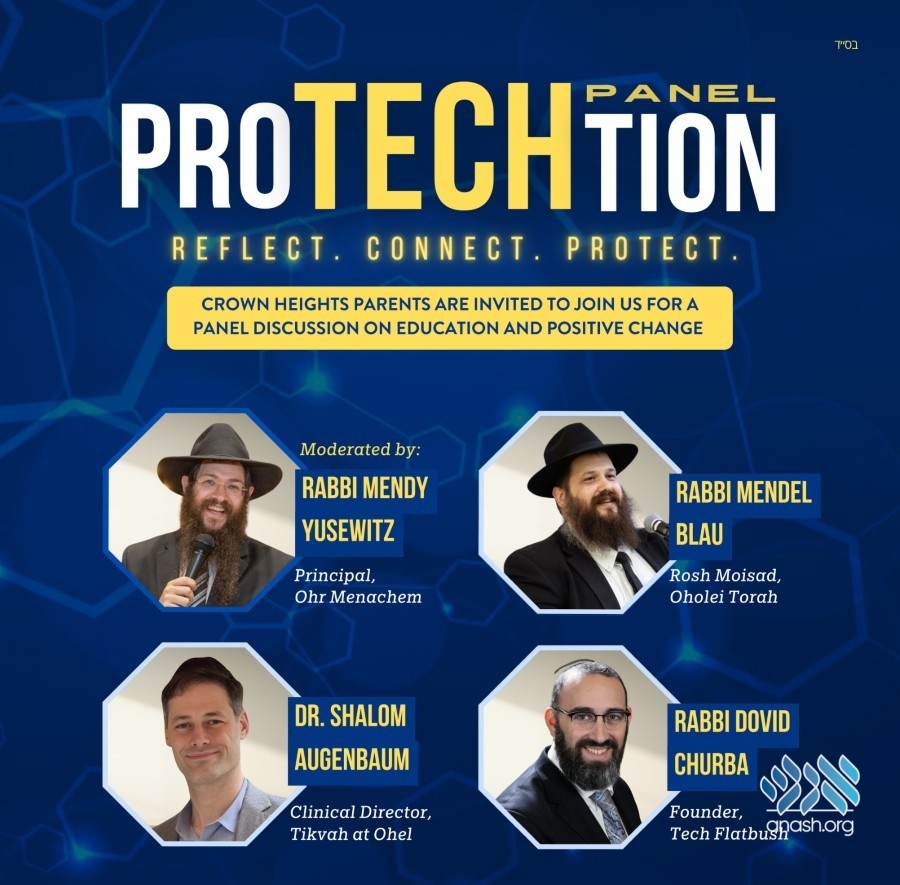 Join us on Wednesday, January 15, ט”ו טבת, at 8:00pm in Bais Rivkah, 470 Lefferts, for the highly anticipated ProTECHtion 2.0. This year’s event features a valuable panel discussion with Rabbi Mendel Blau, Rosh Moisad of Oholei Torah, Dr. Sholom Augenbaum, Clinical Director of Tikvah at Ohel, and Rabbi Dovid Churba, Founder of Tech Flatbush.