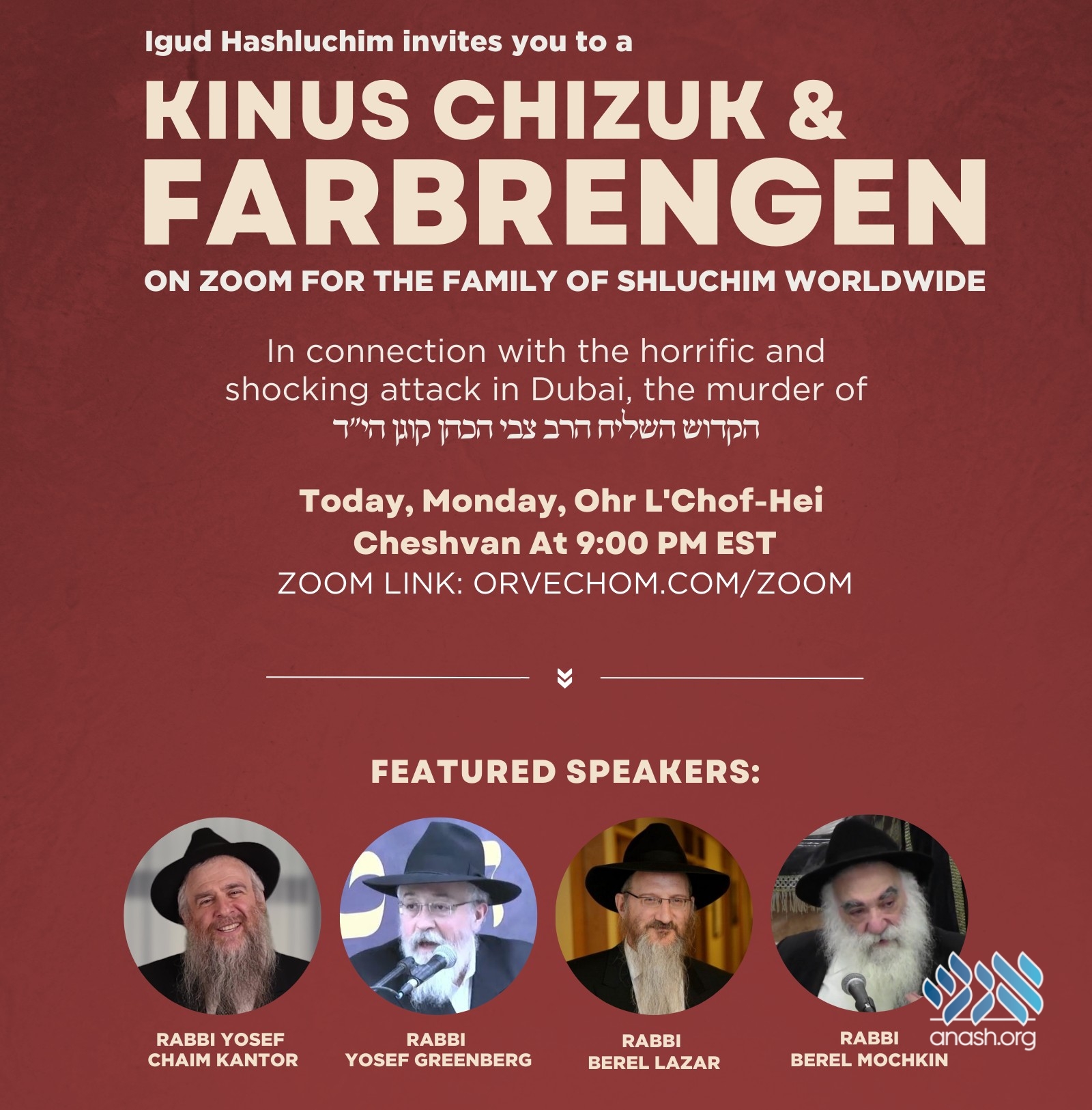 Live at 9 PM: In connection with the horrific murder in Dubai of the Rebbe’s shliach, Rabbi Tzvi Kogan HYD, Or Vechom is holding a special Kinus Chizuk and Farbrengen, featuring Rabbi Berel Mochkin, Rabbi Berel Lazar, Rabbi Yoske Greenberg, and Rabbi Yosef Chaim Kantor.