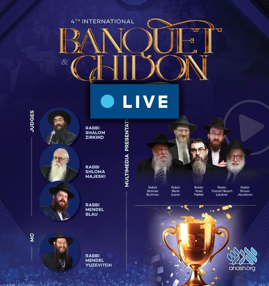 Live at 7:30 PM ET: Join tonight for the International Moshiach Chidon Banquet, celebrating the exceptional learning and dedication of our Mesivta Bochurim in Inyonei Geulah U’Moshiach.