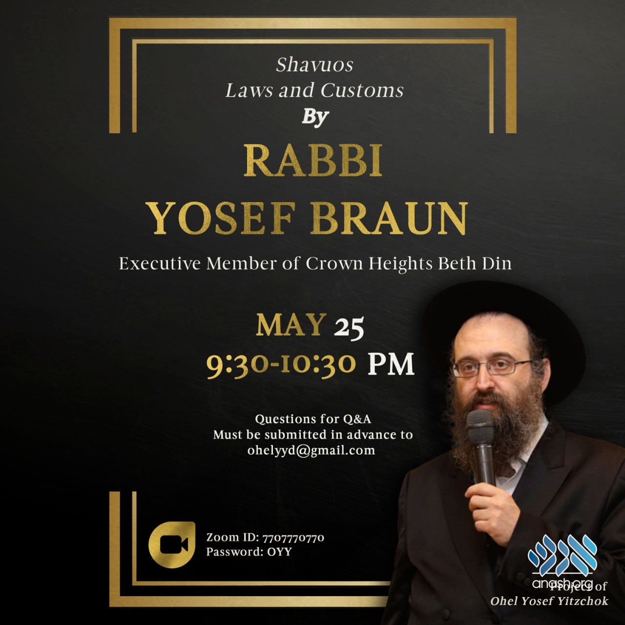 Watch Live at 9:30 pm ET: Harav Yosef Braun will be hosting a pre-yomtov question and answer series on the laws and customs of Shavuos, answering questions submitted by readers.