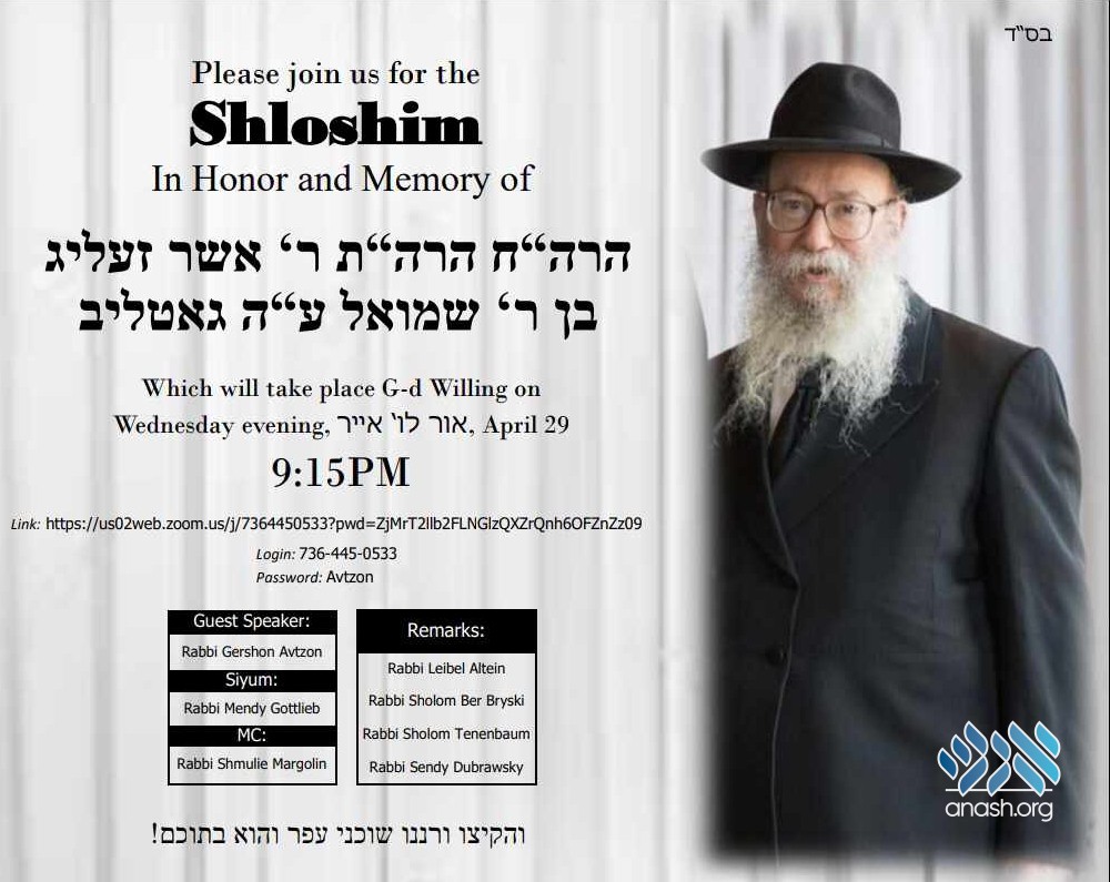Tonight: Shloshim for R’ Asher Zelig Gottlieb