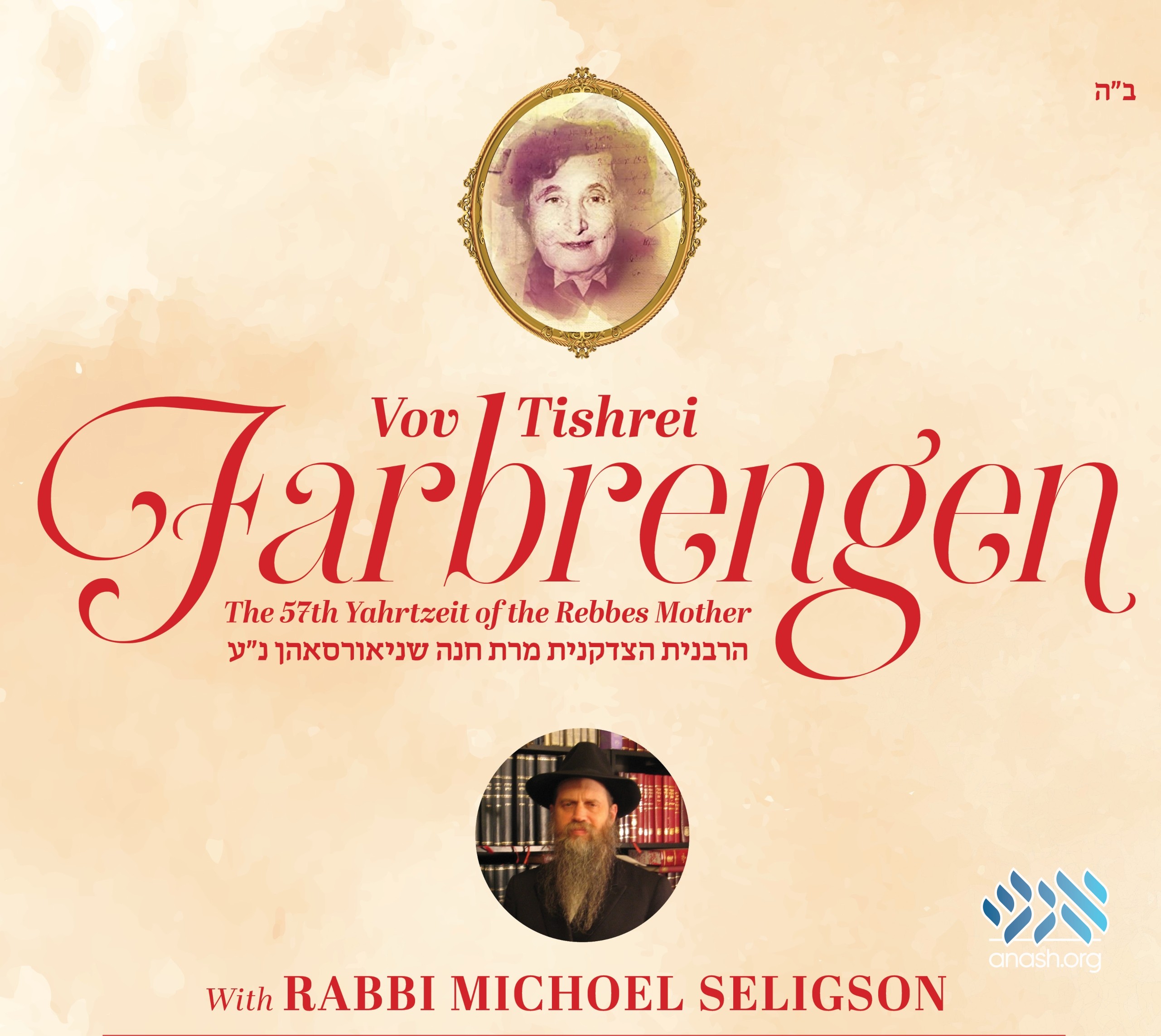 Join us this Sunday night, for a farbrengen with Rabbi Michoel Seligson, in honor of Vov Tishrei. The 57th Yahrzeit of Rebbetzin Chana, the Rebbe’s Mother.