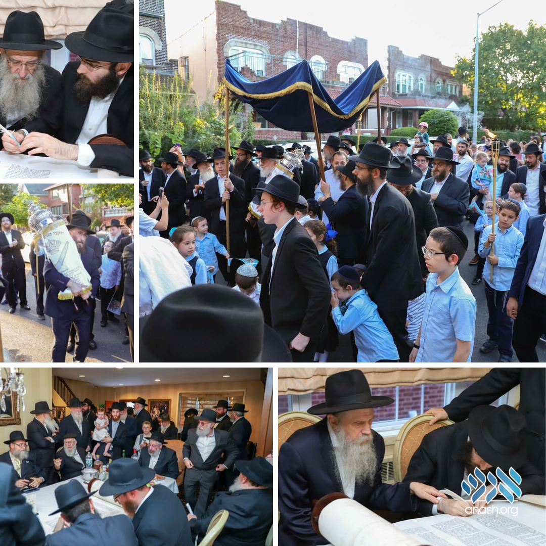 The celebration began at at the home of the Andrusier family, where the final letters were written. Following the Torah’s completion, a joyous procession headed to Beis Binyomin for hakafos and a seudas mitzvah.