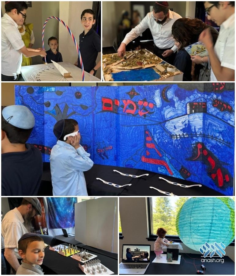 Students at the Sacramento Jewish Academy created interactive scientific exhibits to explain Torah ideas, such as sundial and davening times, 3D glasses and spiritual energy, electric circuit and Shabbos candles, and Avraham and Sara’s “magnetic pull.”