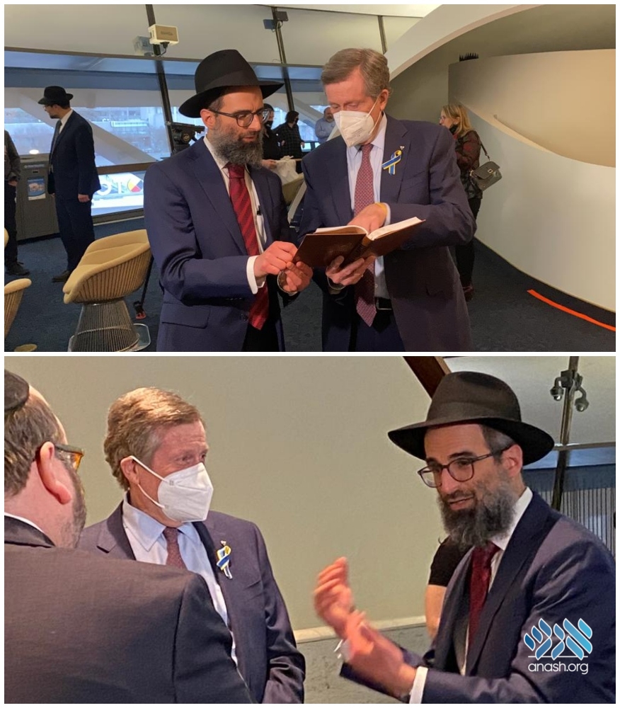 On Tuesday night, while at a meeting at Toronto City Hall together with a small group of invited guests from the Jewish Community, Rabbi Yirmi Cohen presented to the Mayor of Toronto John Tory, a Tehillim in Hebrew and English.