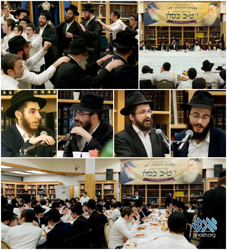 The celebration began with a lavish seudah, as per the custom of chassidim on the day. Throughout the seudah, bochurim and hanhala addressed the crowd, with hatomim Nochum Serabranski making a siyum on Tanya, hatomim Yisrolik Wagner concluding Hayom Yom, and hatomim Shaya Gansbourg finishing a masechta and the entire Shas, as divided in the yearly chalukah.
