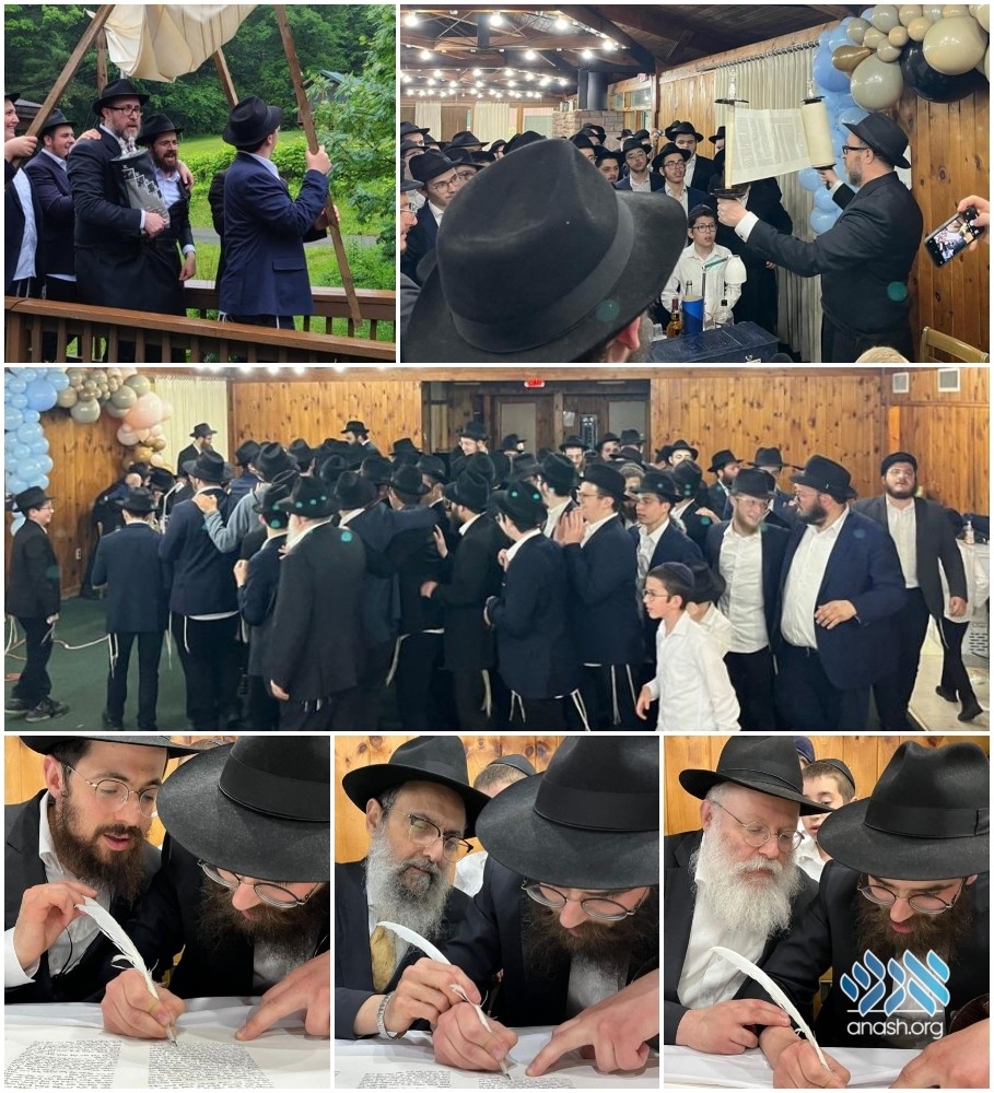 An enthusiastic gathering of bochurim from Mesivta Thornhill, Yeshivas Lubavitch Toronto, hanhala families, and Toronto community members joyously welcomed a new Torah at the Yeshivas Kayitz in Star Lake.