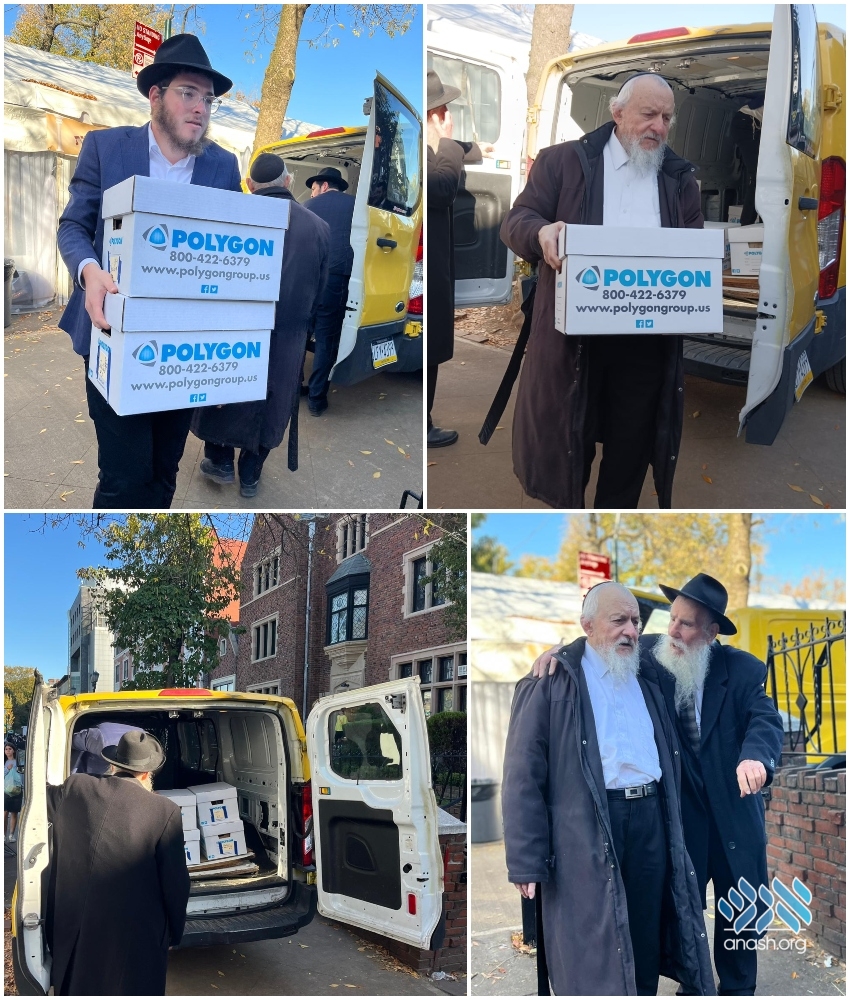After painstakingly ensuring that each book would be salvaged, the books arrived back at the library on Sunday. The books were unloaded by chief librarians Rabbi Sholom Dovber Levin and shliach Rabbi Shlomo Cunin, with the help of a group of enthusiastic bochurim and yungeleit.