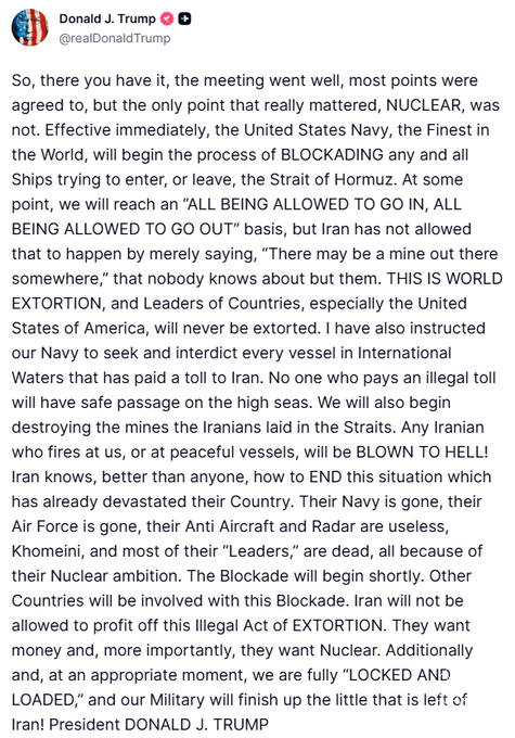 Trump cast the decision as a direct response to what he called “WORLD EXTORTION,” accusing Iran of threatening the global economy by suggesting there are mines in the waterway while demanding illegal payments for so-called safe passage.