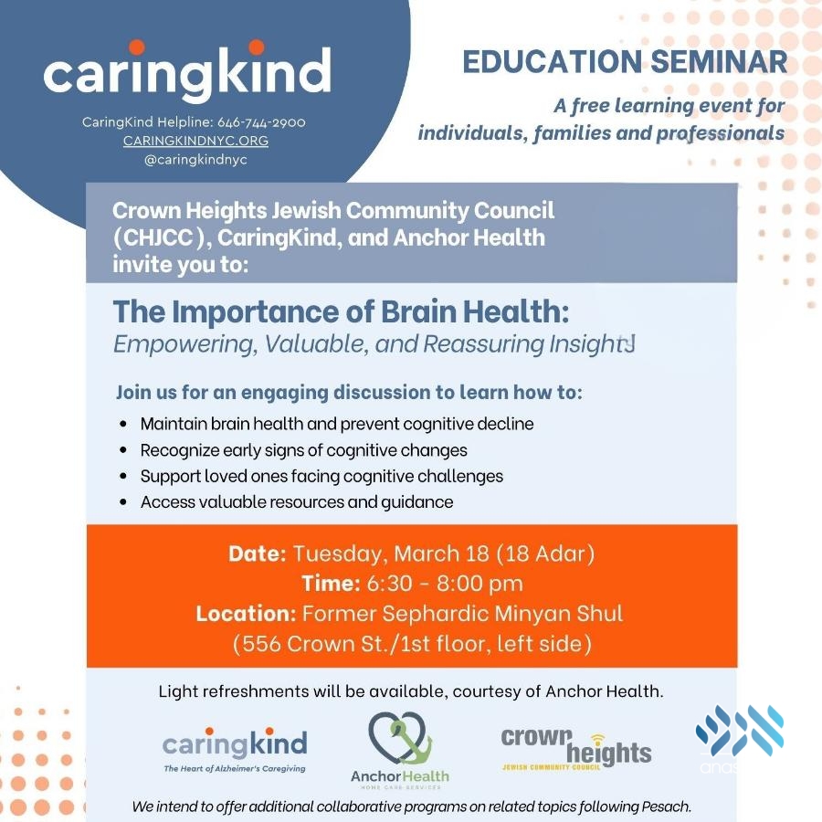 Today, the Crown Heights Jewish Community Council (CHJCC) and CaringKind are hosting an in-person educational seminar on brain health. Topics include recognizing cognitive changes, preventing decline, supporting loved ones, and accessing community resources.