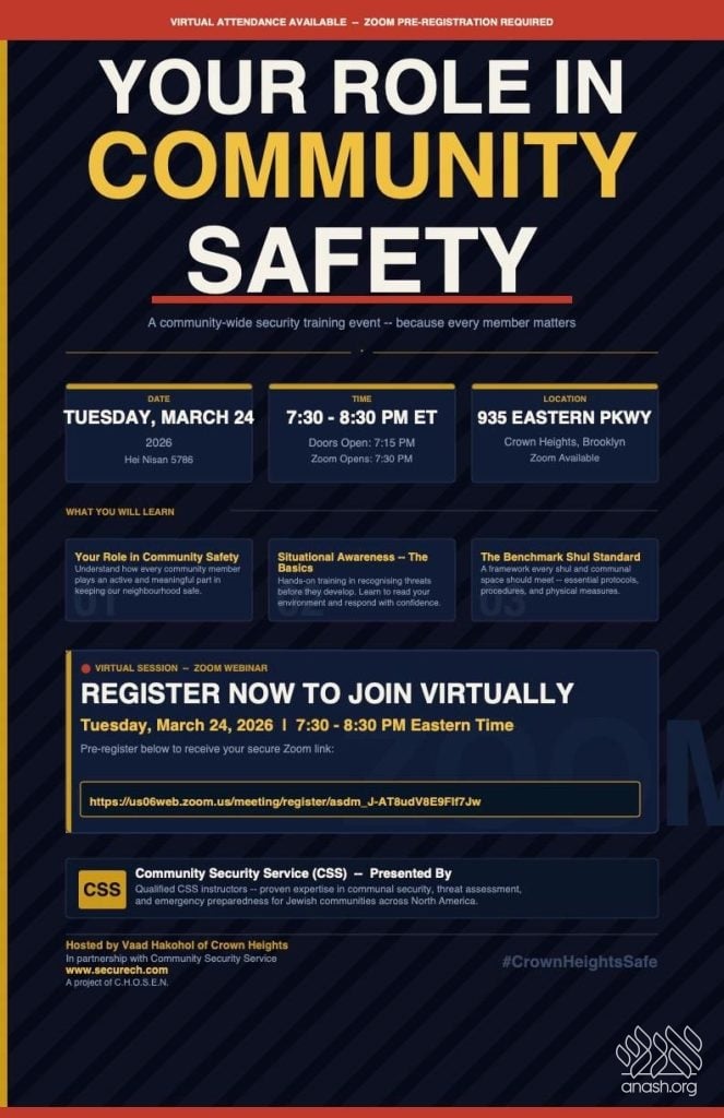 The event, titled “Your Role in Community Safety,” will take place on Tuesday, March 24, 2026, from 7:30 to 8:30 PM (ET), with doors opening at 7:15 PM. It will be held in person at 935 Eastern Parkway in Crown Heights, with a live Zoom option available for those who prefer to join remotely.