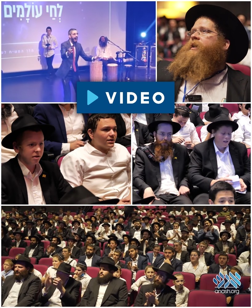 300 students and staff of Chabad Yeshiva Chanoch Lenaar in Tzfas, stage a brilliant performance of the Chabad niggun Ho’aderes V’hoemuna conducted by singer Simche Friedman.