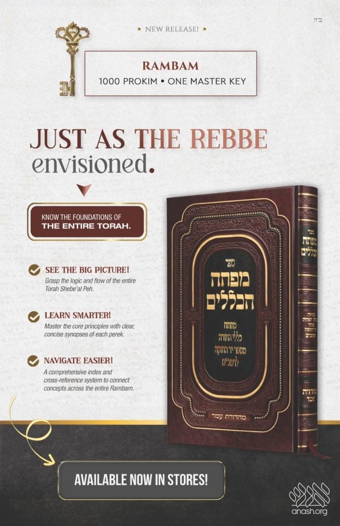 A transformative new tool has arrived in bookstores, promising to change the way Anash learn and master the Rambam. Mafteach HaKlallim is designed to provide learners with a clear, comprehensive “big picture” of the entire Mishneh Torah, making the vast sea of the Yad HaChazakah more accessible than ever.