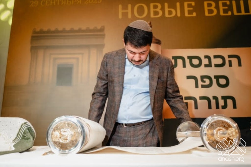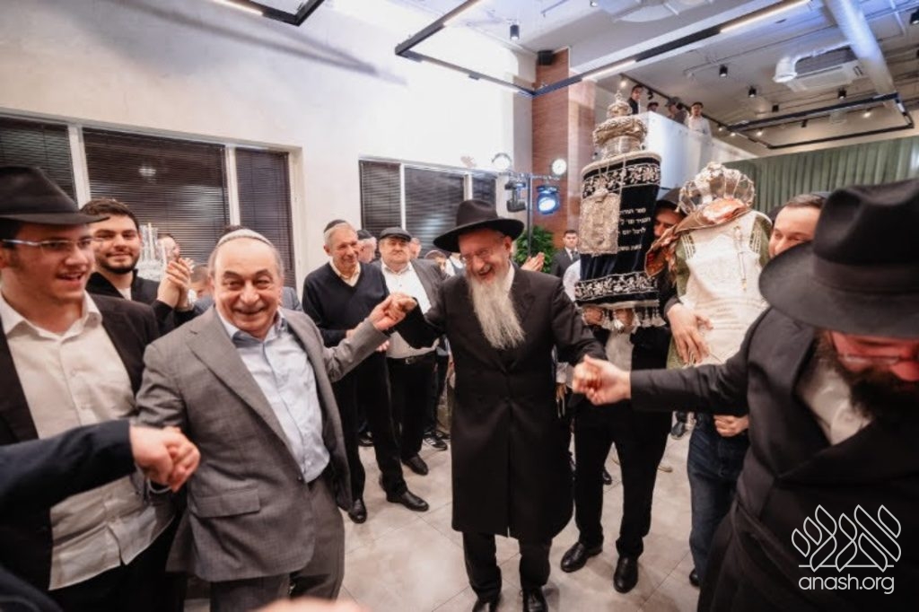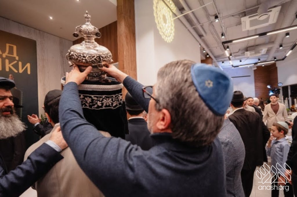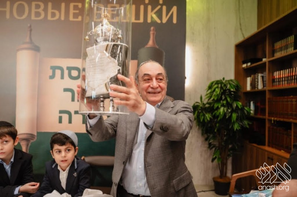 The celebration, held in the shul hall, was skillfully led by the family’s friend, the shaliach Rabbi Avraham Elimelech Gedzh, who invited the Chief Rabbi Shlita to finish writing the Sefer Torah. After Divrei Torah and blessings, he presented their sons Mr. David and Mr. Moshe with a prestigious certificate along with a dollar and blessings from the Lubavitcher Rebbe, on behalf of the charitable organizations in Moscow, which the Yakubov family supports regularly.
