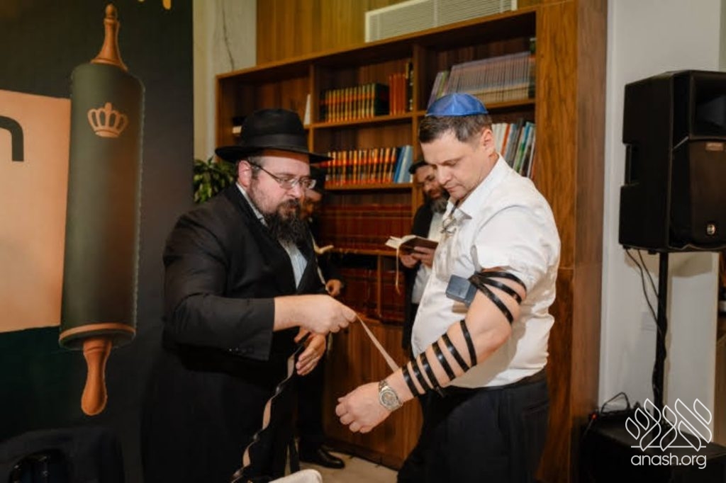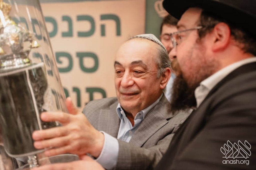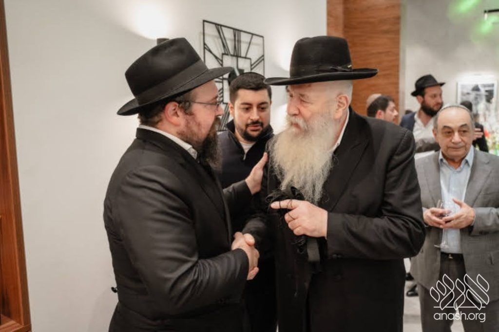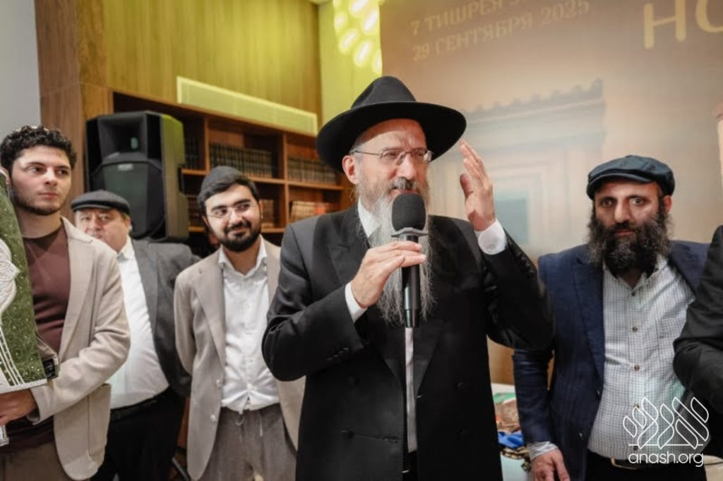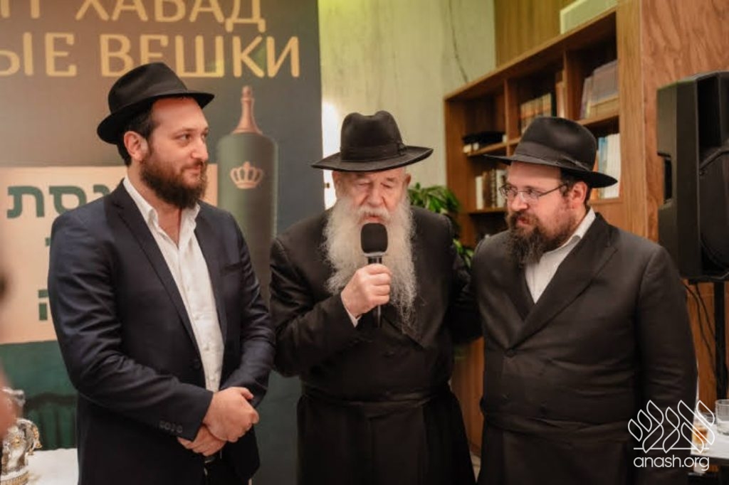 The celebration, held in the shul hall, was skillfully led by the family’s friend, the shaliach Rabbi Avraham Elimelech Gedzh, who invited the Chief Rabbi Shlita to finish writing the Sefer Torah. After Divrei Torah and blessings, he presented their sons Mr. David and Mr. Moshe with a prestigious certificate along with a dollar and blessings from the Lubavitcher Rebbe, on behalf of the charitable organizations in Moscow, which the Yakubov family supports regularly.