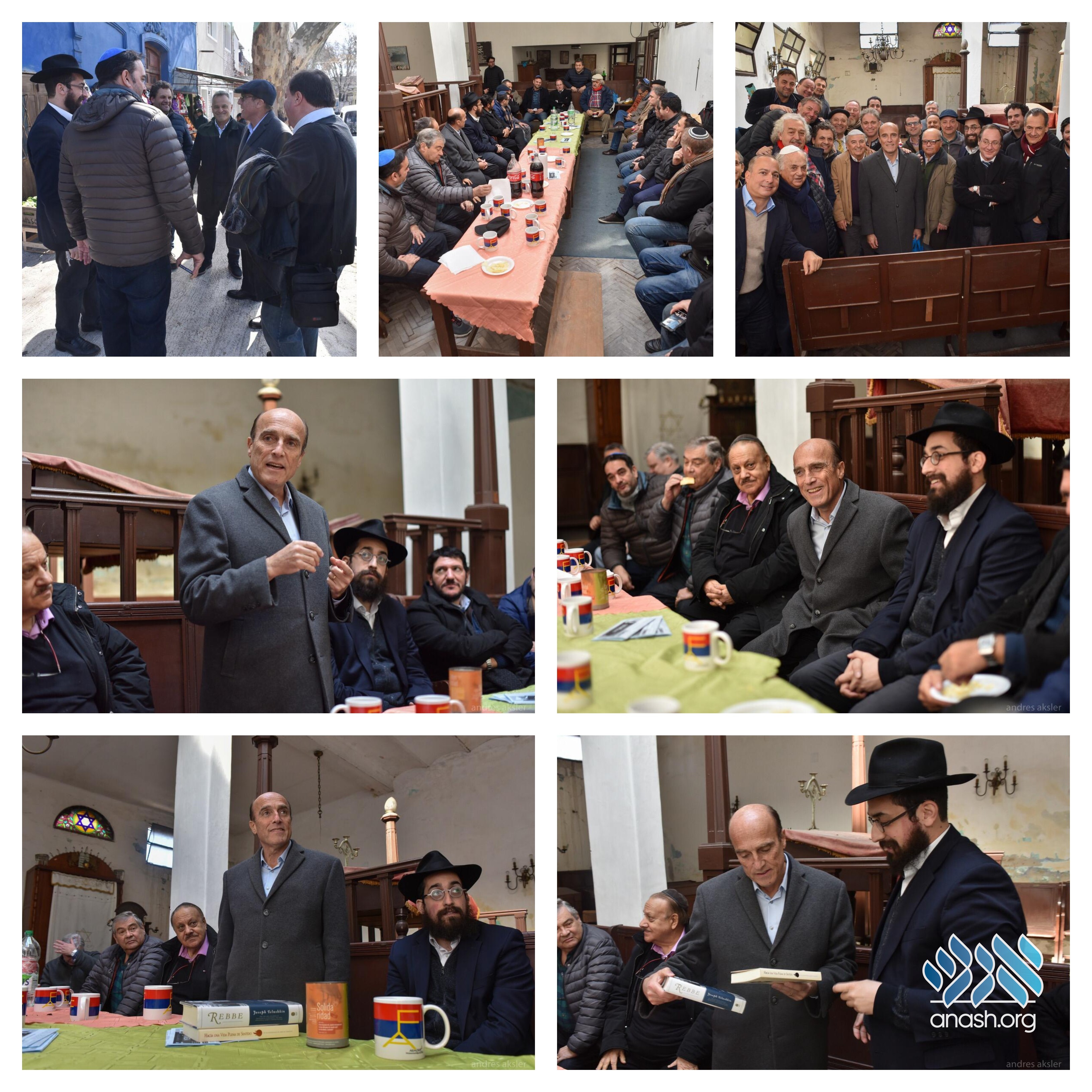Uruguay Presidential candidate Ing. Daniel Martinez was recently welcomed at a historic shul by a group from Chabad of Montevideo, with shliach Rabbi Mendy Shemtov and community members.