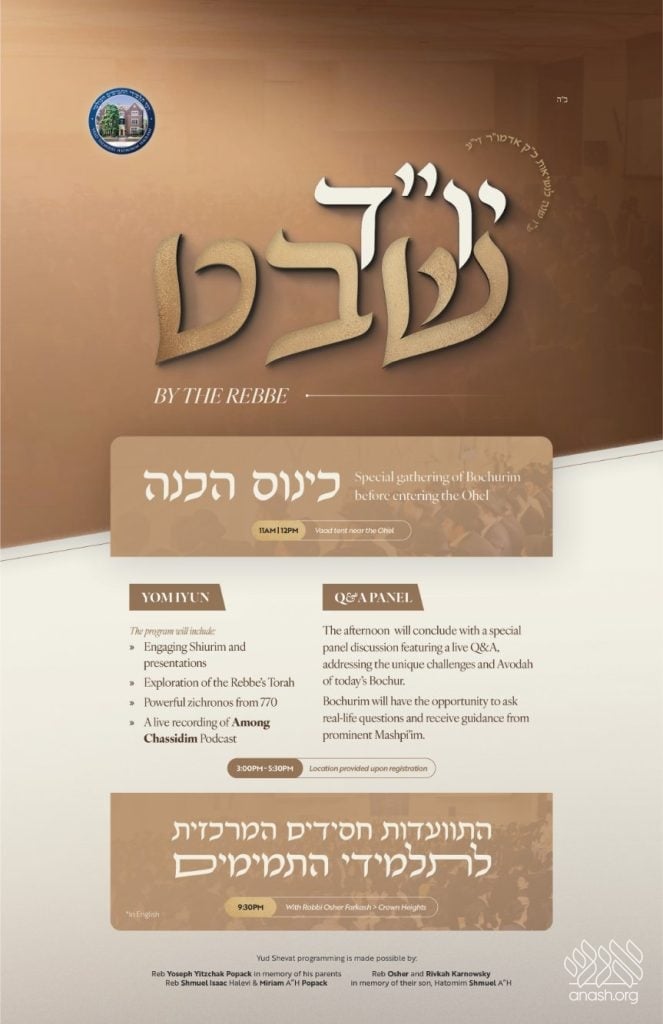 The day will conclude with a central Yud Shevat Fabrengen in Crown Heights, in English, led by Rabbi Osher Farkash, bringing together Bochurim in the spirit of Achdus.