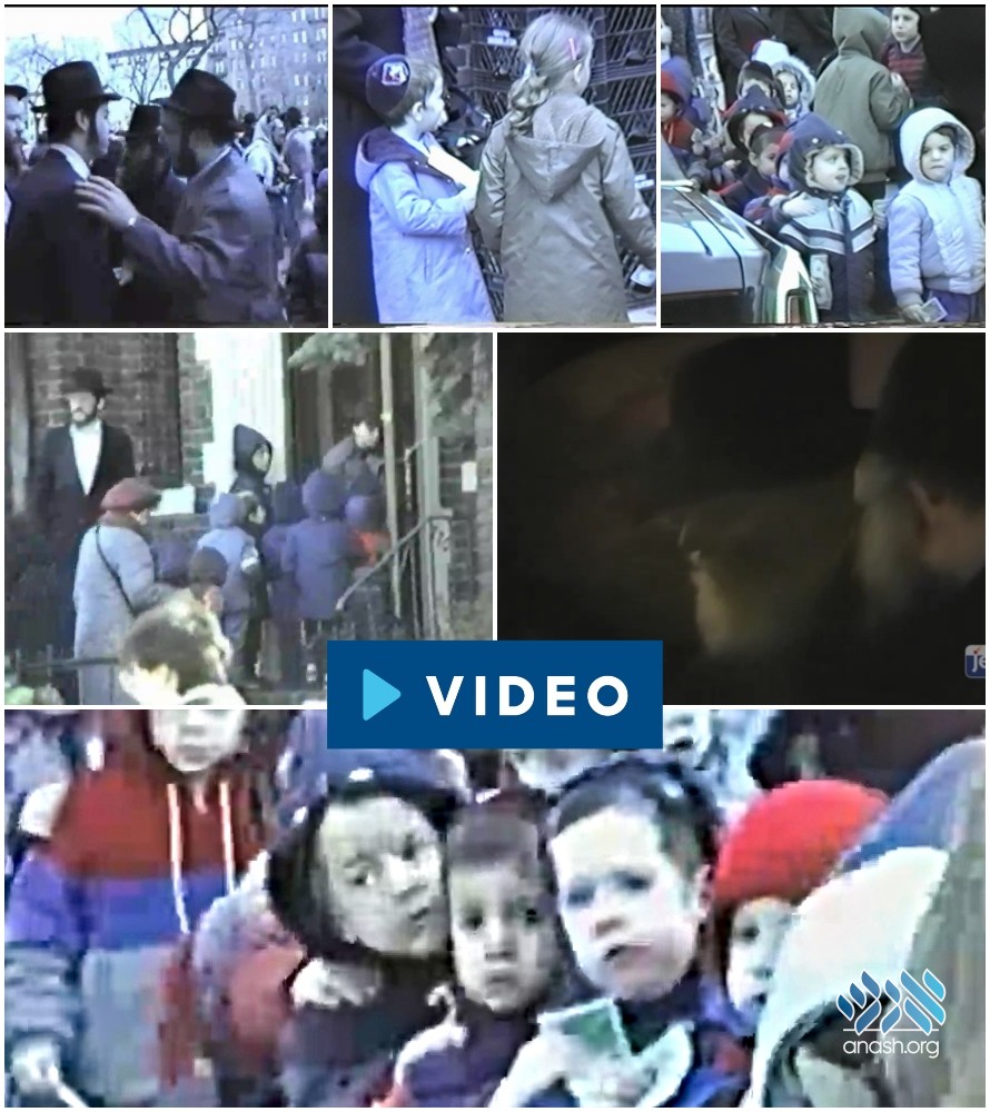 This never before seen video captures the crowds streaming to 770 from all over Crown Heights and the surrounding areas as news of the distribution spread. Buses of school children and mothers holding infants, everyone quickly lined up inside and outside 770 for the unique opportunity to receive a dollar for Tzedakah from the Rebbe’s holy hand.