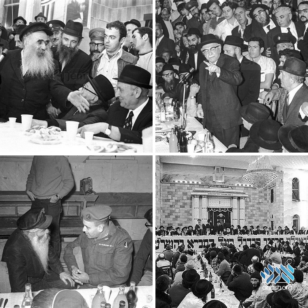 Amidst the festivities, a lively conversation between President Zalman Shazar (seated 5th from left), acclaimed writter Shai Agnon (7th from left), and Rabbi Nochum Goldshmid. Also seen is Rabbi Shlomo Yosef Zevin.