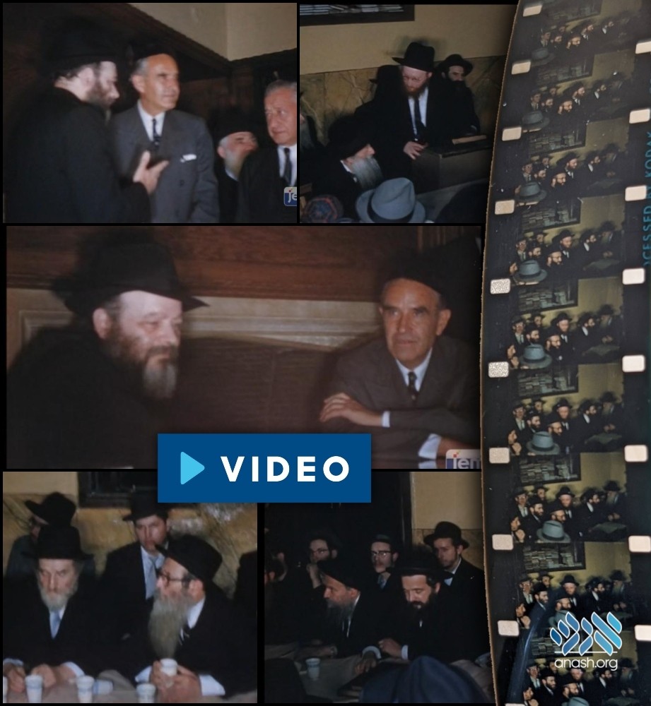 Harriman served as Governor of New York from January 1955 through December 1958. Markings on the reel indicate that these scenes were shot in October 1958, in the days immediately following Sukkos 5719. Harriman apparently visited the Rebbe in his final month in office, during an ultimately unsuccessful campaign for reelection. Diaries of the happenings at 770 during the month of Tishrei 5719 indeed record a Kinus Torah that took place on the day following Sukkos.