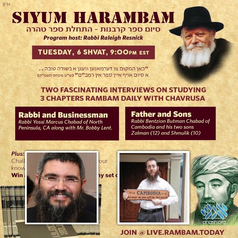 Tomorrow, 6 Shevat, marks the Siyum of Sefer Korbanos for those learning 3 Prokim of Rambam. Once again, the organizers at www.rambam.today have put together an engaging virtual program, to be hosted by Rabbi Raleigh Resnick, Shliach to the Tri-Valley, CA. This time, the focus will be on learning Rambam b’chavrusa.
