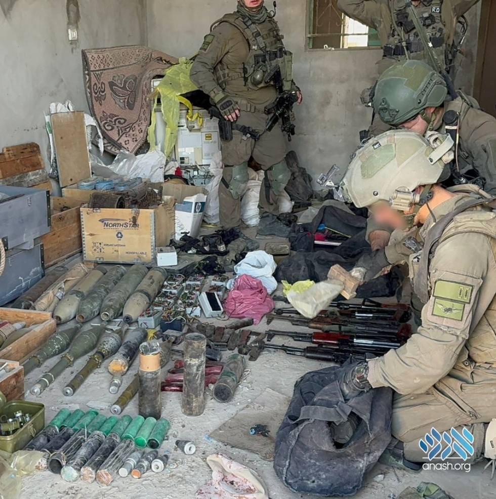 In Khan Younis, troops followed intelligence information and located a large weapons depot adjacent to a school which is currently being used as a shelter for civilians. The warehouse contained dozens of weapons, ammunition, warheads for rockets and mortars, grenades, and other military equipment. Troops found a second weapons depot nearby. The two locations had both Hamas and Palestinian Islamic Jihad (PIJ) flags.