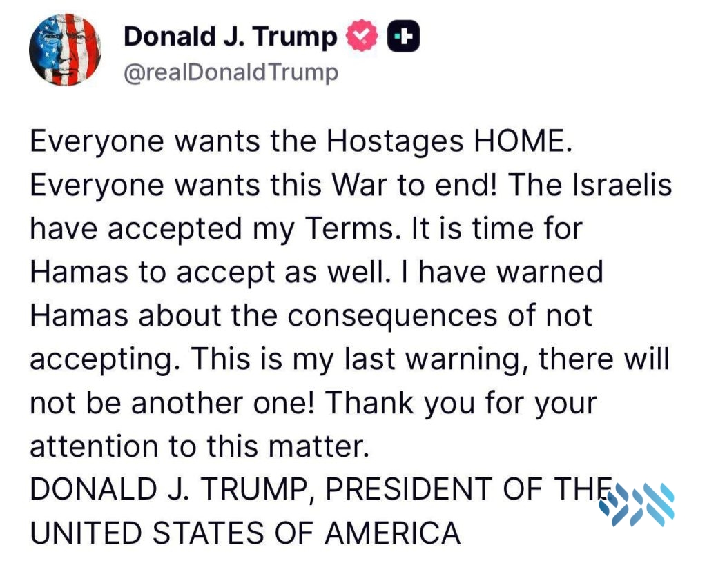 Trump says that Israel already accepted the terms, and he’s giving Hamas a final warning to accept as well.