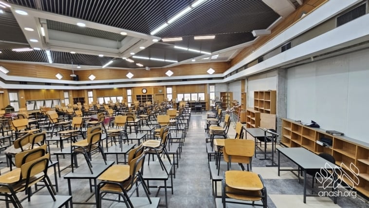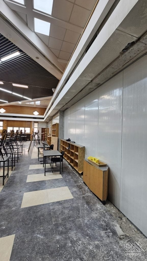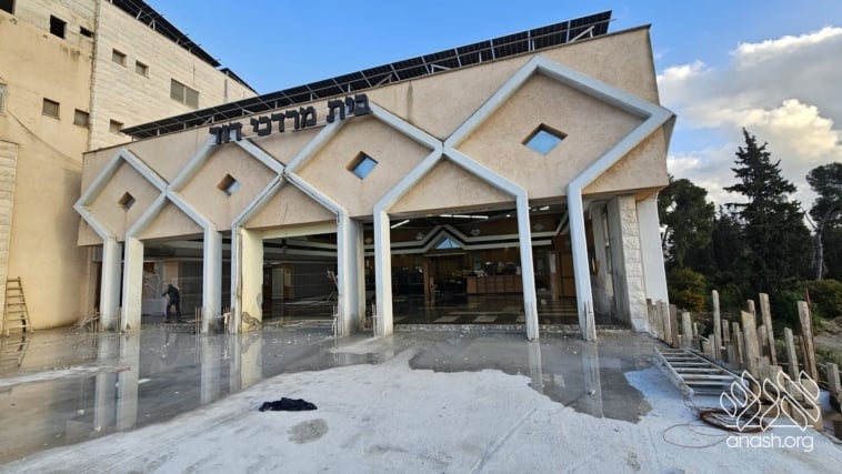 A temporary wall was carefully constructed in order to allow the regular learning schedule to continue in an orderly and uninterrupted manner while work continues. This solution has enabled the yeshiva to maintain its routine and atmosphere while the construction moves forward.