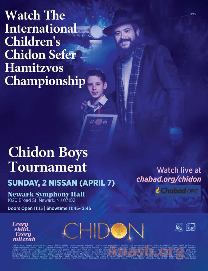 Watch the Chidon Sefer Hamitzvos Boys Tournament. The webcast begins TODAY, Sunday, 2 Nissan/April 7 at 11:45 a.m. and runs through